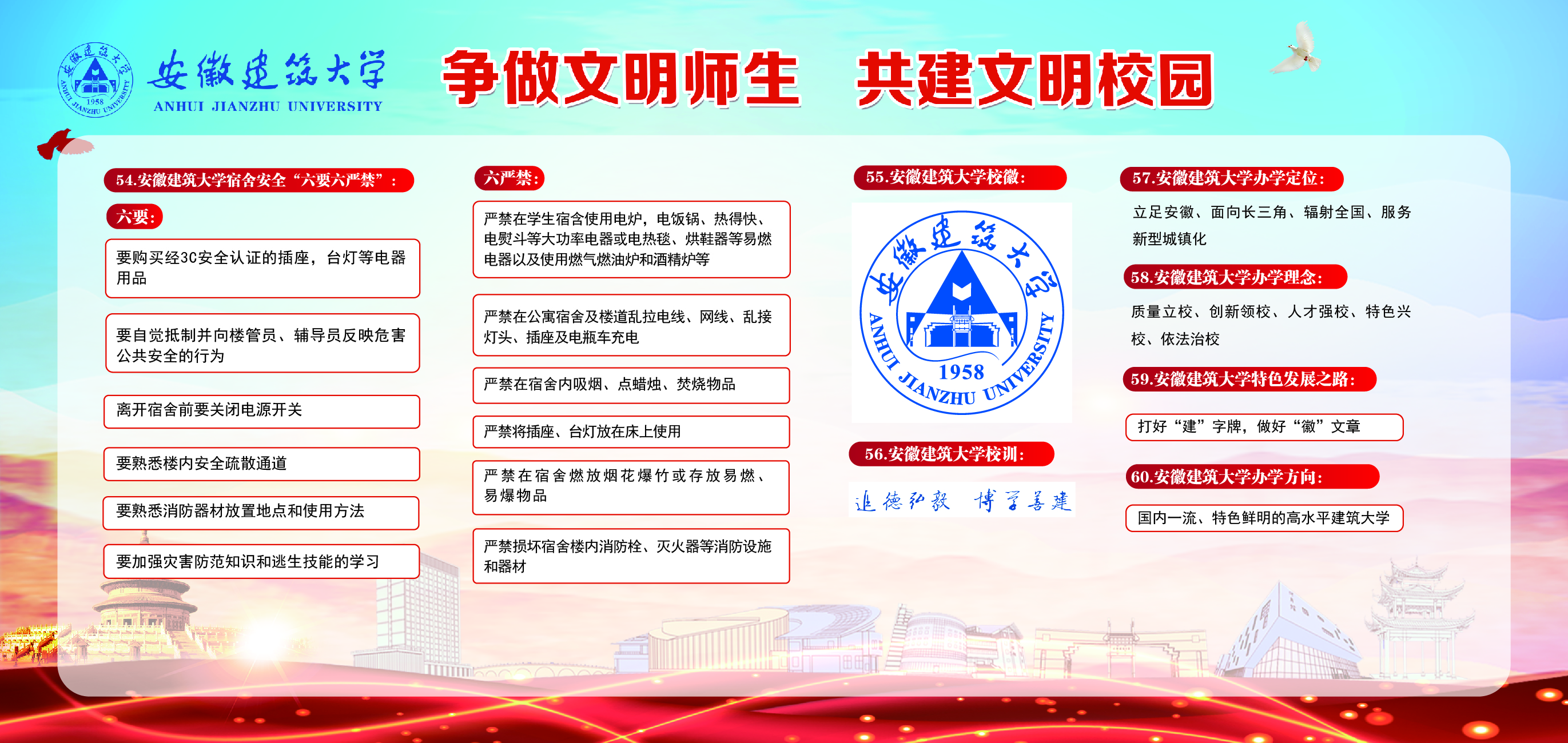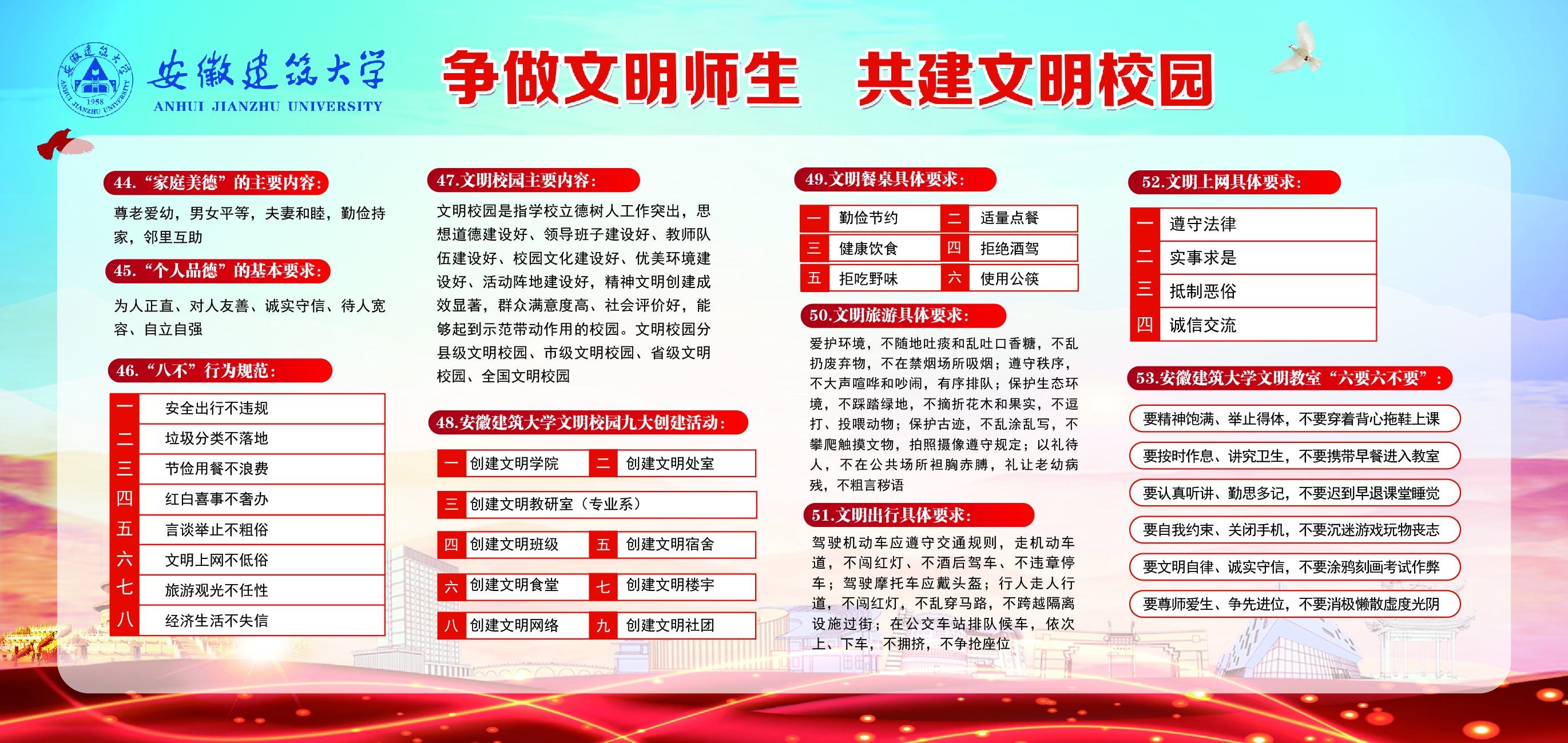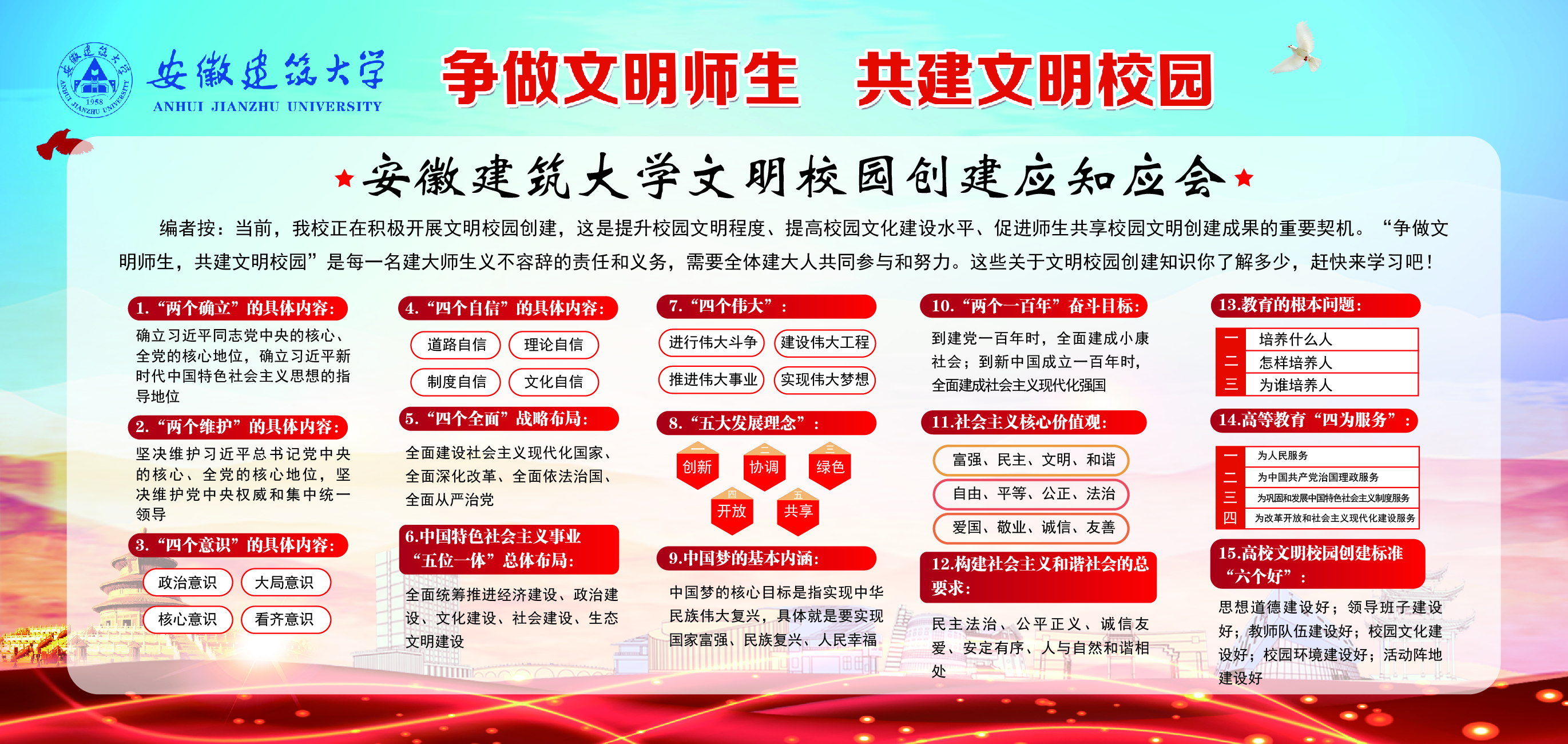 编者按:当前,beat365官网正在积极开展文明校园创建,这是提升校园文明程度、提高校园文化建设水平、促进师生共享校园文明创建成果的重要契机。“争做文明师生,共建文明校园”是每一名建大师生义不容辞的责任和义务,需要全体建大人共同参与和努力。这些关于文明创建知识你了解多少,赶快来学习吧!