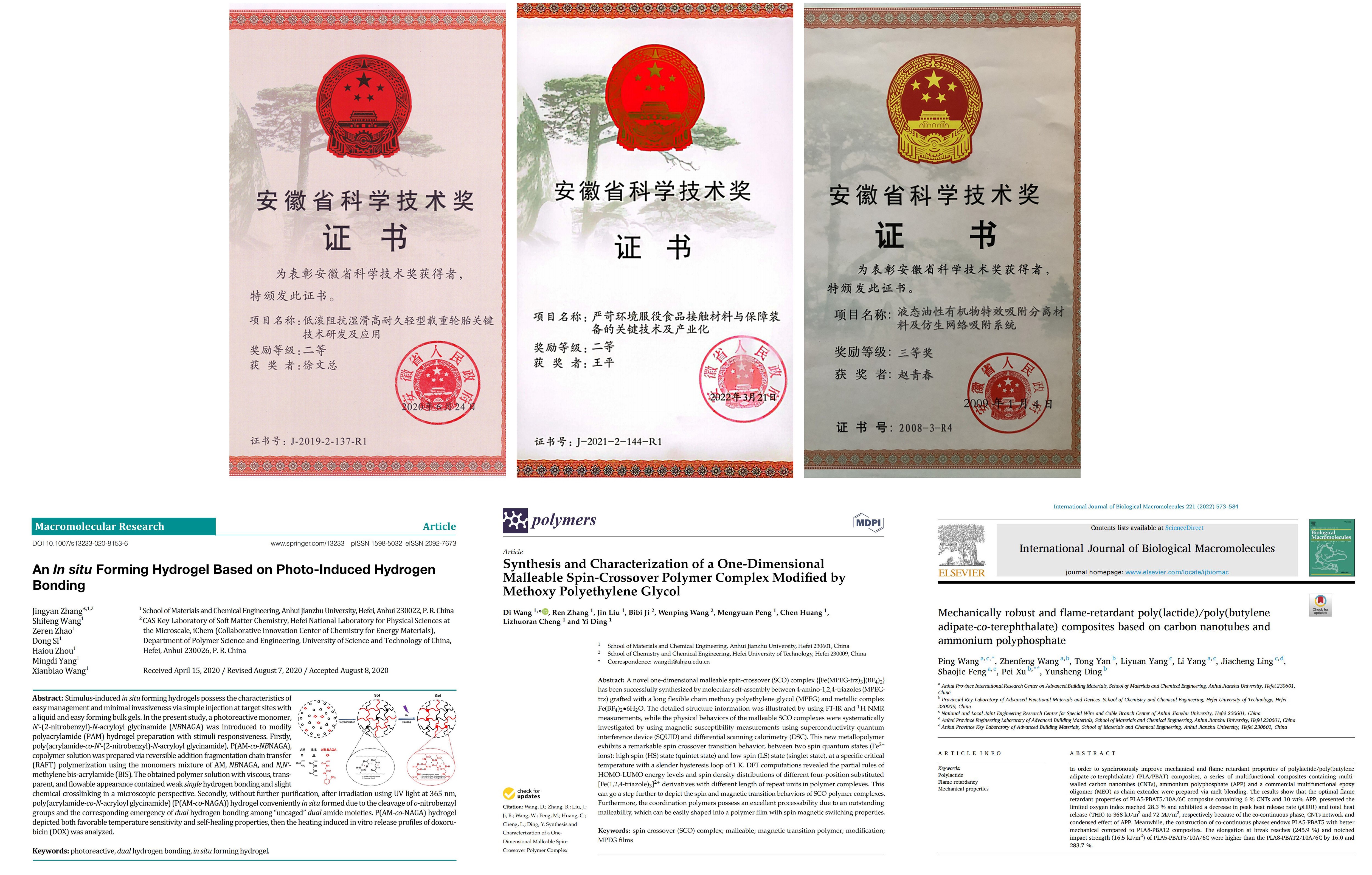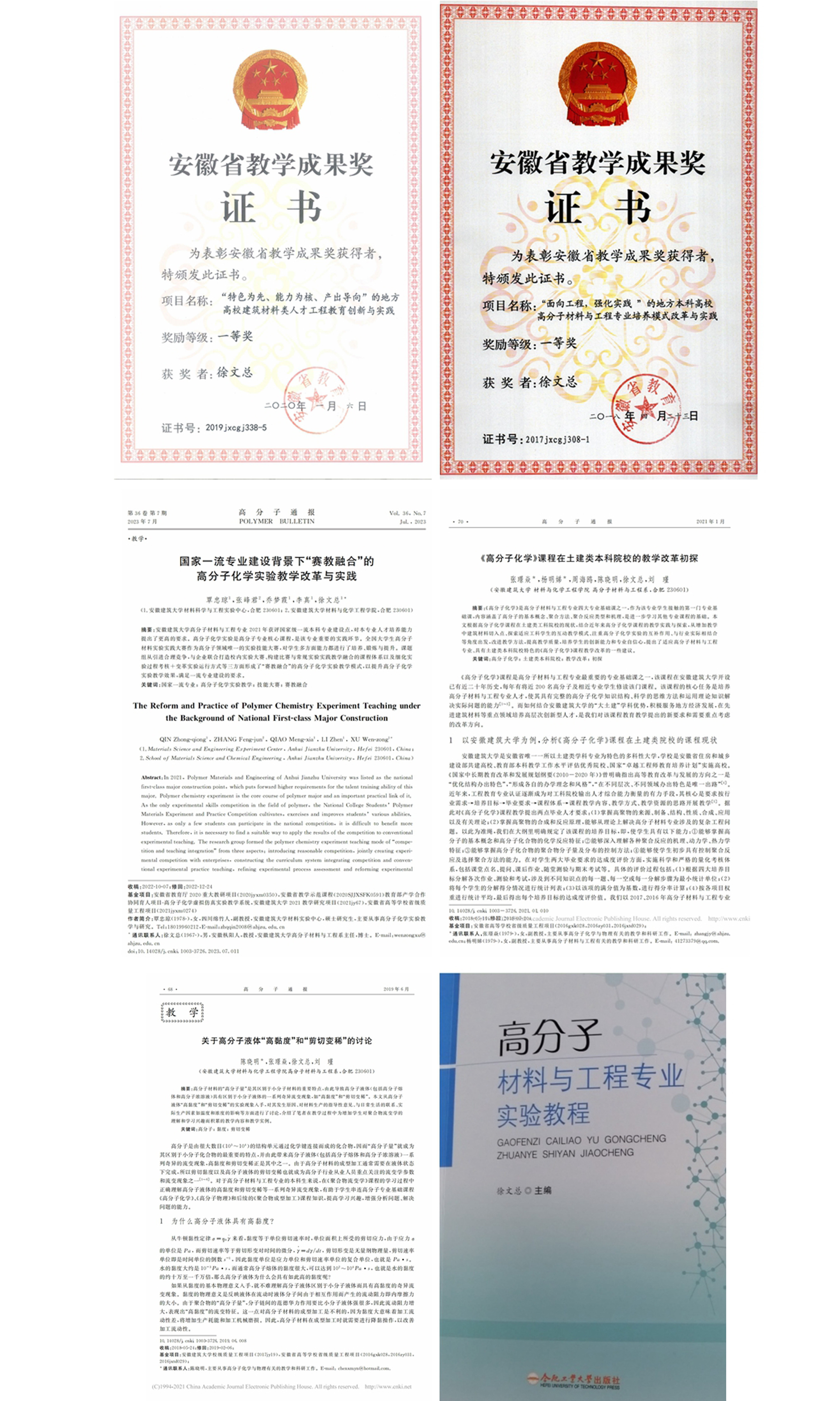 专业拥有学校第一批硕士学位授权点,学校2021年获批博士学位授权点,土木工程材料是其中特色方向之一。教师共承担国家科技支撑计划项目、国家自然科学基金、安徽省重点研发计划项目、安徽省自然科学基金等省级以上科研项目100余项,发表SCI/EI高质量论文300余篇,获安徽省科技进步奖7项、授权发明专利60余件,利用这些科研成果开设的专业综合设计性项目50余项,同时,教师根据研究成果编写的《高分子综合设计性实验》教材也即将正式出版发行;学生参与发表的SCI论文20余篇(代表性论文见下图)。