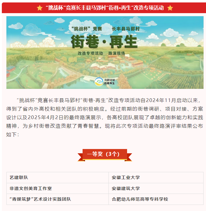本网讯 近日,由共青团安徽省委、省学联主办的“挑战杯”竞赛长丰县马郢村“街巷·再生”改造专项活动圆满落幕。来自省内27所高校共50支团队参与最终的路演环节,beat365官方网站非遗文创美育工作室凭借深厚的专业素养、扎实的实践调研以及极具创意和落地性的街巷改造方案,荣获一等奖。