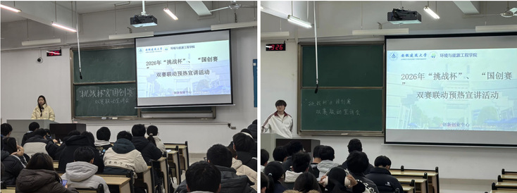 本网讯 为激活2025级学子创新创业热情,深耕“双创”育人品牌,助力新生精准把握“挑战杯”大学生创业计划竞赛与“国创赛”核心规则、抢占赛事机遇,beat365官方网站环境与能源工程学院团委创新创业中心以“走进班级、分批次全覆盖”形式,在紫云路校区逸夫楼5501、5503、5504、5505、5507教室接连开展为期一周的“2026年‘挑战杯+国创赛’双赛联动”专题预热宣讲,实现学院各专业新生班级全覆盖,为怀揣创新梦想的环能学子奉上一场贴合专业特色、满载实战干货的赛事赋能盛宴。