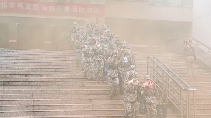 疏散开始前,军训教官对2023级全体新生进行消防安全培训,重点介绍了常见火灾的扑救方法、紧急情况的疏散逃生技巧以及日常预防火灾发生基本常识。随后,一声令下,疏散逃生演练开始,火灾预设地点顿时浓烟四起,“被困人员”用湿毛巾捂住口鼻、低腰疏散至安全地带,全部人员在3分钟时间内疏散完毕,火势被有效控制后扑灭,演习圆满完成。