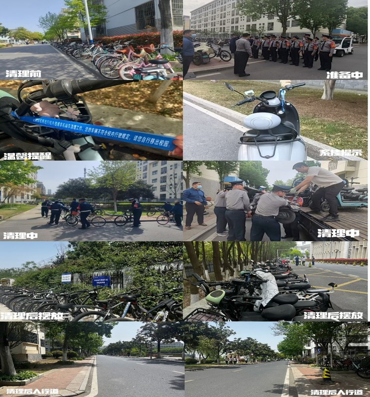 校园交通治理是一项系统工程。由学校保卫处牵头,学生处、后勤管理处等多个部门协同联动,召开专题协调会,明确“制度完善、设施优化、教育引导”的三维路径。学校以2022年出台的《beat365官方网站电动自行车管理办法(暂行)》为基础,结合校园交通安全教育和巡视整改要求,发布了“关于开展紫云路校区易海东路人行道车辆迁移及校内违规非机动车清理工作的通知”,聚焦紫云路校区易海东路非机动车乱停放以及无牌套牌等问题,迅速制定并实施一系列针对性举措,全力规范交通秩序。