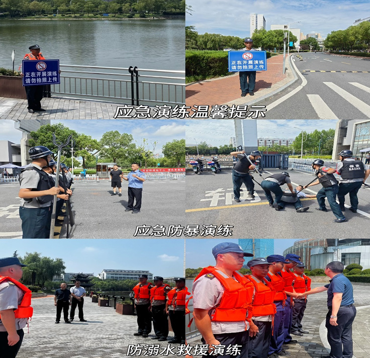 针对暑期校园安全风险特点,保卫处联合属地公安开展应急演练。在易海湖畔,模拟“师生落水”场景,巡逻岗迅速携带抛绳器、救生圈等专业设备赶到现场抛绳救人并抛出救生圈提供浮力支持,将“溺水者”救上岸后,立即演示心肺复苏急救技能同时拨打110报警电话;紫云路校区南大门广场上,应急防暴演练紧张进行,“持刀闯入者”突然出现,门岗人员迅速响应,立即启动应急预案,使用钢叉、盾牌等器械与“闯入者”周旋。整个过程响应迅速,从发现“险情”到成功处置仅用几分钟。经开分局民警唐卫东现场指导战术动作,强调“1分钟自救、3分钟互救、5分钟增援”的应急处置原则。