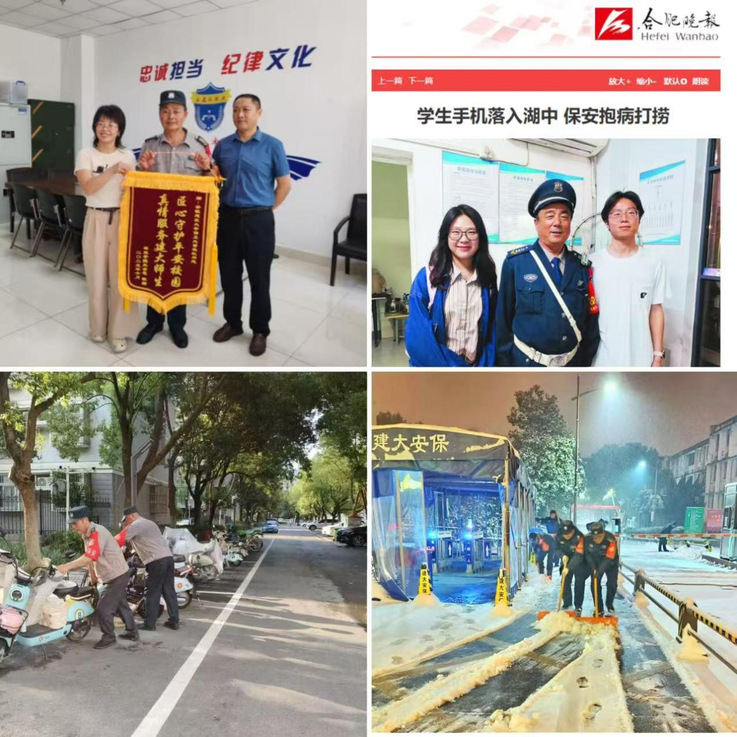 牢固树立“师生为本、服务至上”理念,推动从“管理者”向“服务者”角色深化。24小时值班电话成为师生信赖的“安全热线”;全年提供监控调阅、失物寻找服务数百次;协助接送病患、帮助受困师生,于危急时刻伸出援手。持续优化校外人员进校预约、宿舍门禁联动迎新等系统,提升服务便捷性。将便民设备引入警务站,把服务送到师生身边。校长信箱中的感谢信、一面面锦旗,合肥晚报报道《学生手机落入湖中,保安抱病打捞》事迹,这些都见证了安保人员拾金不昧、热心助人、尽职尽责的朴实形象,安全工作的底色充满了守望相助的“建大温度”。