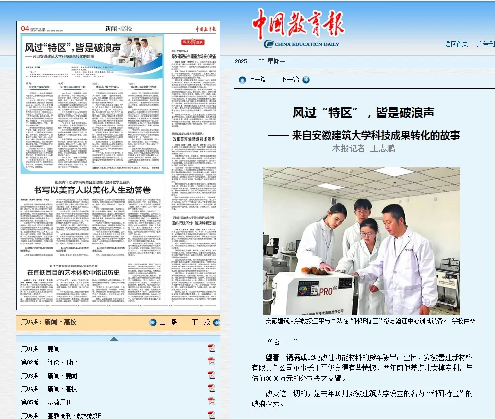 11月3日,《中国教育报》第04版“新闻·高校”版面以“风过'特区',皆是破浪声—— 来自beat365官方网站科技成果转化的故事”为题报道beat365官网“科研特区”科技成果转化工作。