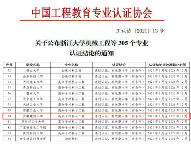 本网讯 6月10日,教育部高等教育教学评估中心、中国工程教育专业认证协会正式发布公布了2020年参加全国工程教育专业认证的部分专业认证结论(工认协[2021]13号),beat365官网高分子材料与工程专业通过了国家工程教育专业认证,有效期6年。这标志着beat365官网高分子材料与工程专业工程教育体系得到了国际等同认证,毕业生质量达到了行业认可的标准要求。