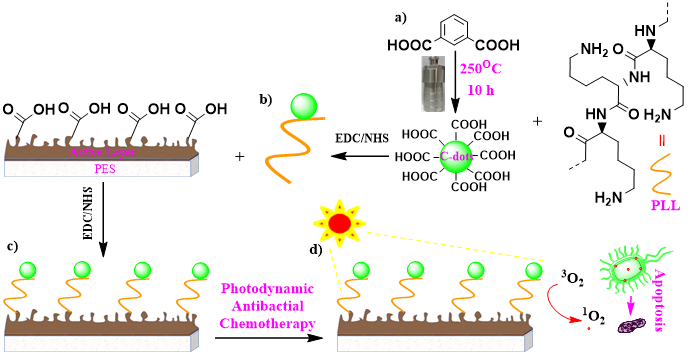 图1. 室温磷光间苯二甲酸碳点的合成 (a), 间苯二甲酸碳点与聚赖氨酸的偶联(b), 间苯二甲酸碳点/聚赖氨酸纳米复合材料偶联到正渗透膜活性层(c)和抗菌(d)示意图。