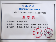 第十五届全国大学生化工设计竞赛(华中赛区) | 2021 | 中国化工学会、中国化工教育协会、教育部高等学校化工类专业教学指导委员会 | 一等奖 |