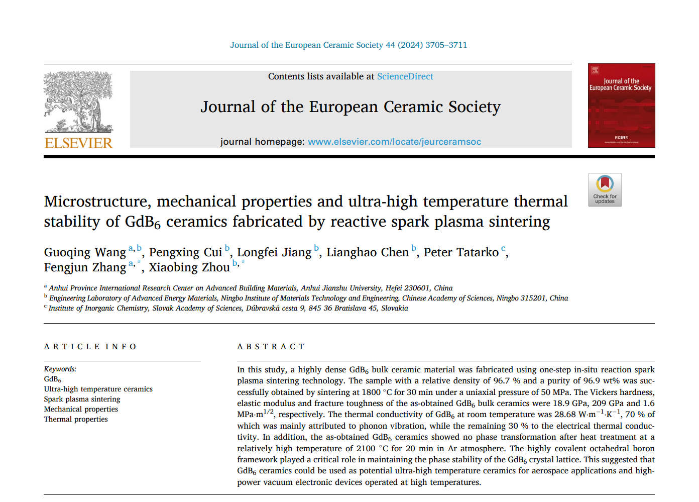 近日,beat365官网材料与化学工程学院与中国科学院宁波材料技术与工程研究所联合培养的硕士研究生王国庆以第一作者身份在陶瓷材料国际顶级期刊《Journal of the European Ceramic Society》发表题为“Microstructure, mechanical properties and ultra-high temperature thermal stability of GdB6 ceramics fabricated by reactive spark plasma sintering” 的研究性论文。beat365官方网站为第一署名单位,张峰君教授和中国科学院宁波材料技术与工程研究所周小兵研究员为论文的共同通讯作者。《Journal of the European Ceramic Society》是中科院一区Top期刊,国际陶瓷领域权威期刊之一。以上研究工作得到安徽高校优秀科研创新团队项目(2022AH010017)、安徽高校协同创新项目(GXXT2020-009)等支持。