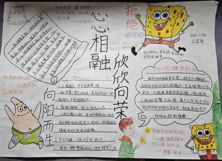 活动宣传后,获得了广大材化学子的积极参与。这些手抄报作品以自我认知、情绪管理、压力应对等心理健康主题为核心,用图画、文字、色彩等多种方式表达参赛选手对心理健康的理解和探索,不仅展现出了同学们的艺术才华,更展示了他们对于自身心理健康的关注和认识。比赛现场,选手们通过PPT的讲解,向现场评委与观众展示他们创作的心路历程,并且对于手抄报画面进行更深刻的解读,与现场观众产生情感共鸣。最终,23无机非1班的翁欣雨、王训婧小组因色彩饱和绚丽、画面丰富的参赛作品获得了本次心理手抄报活动的一等奖。