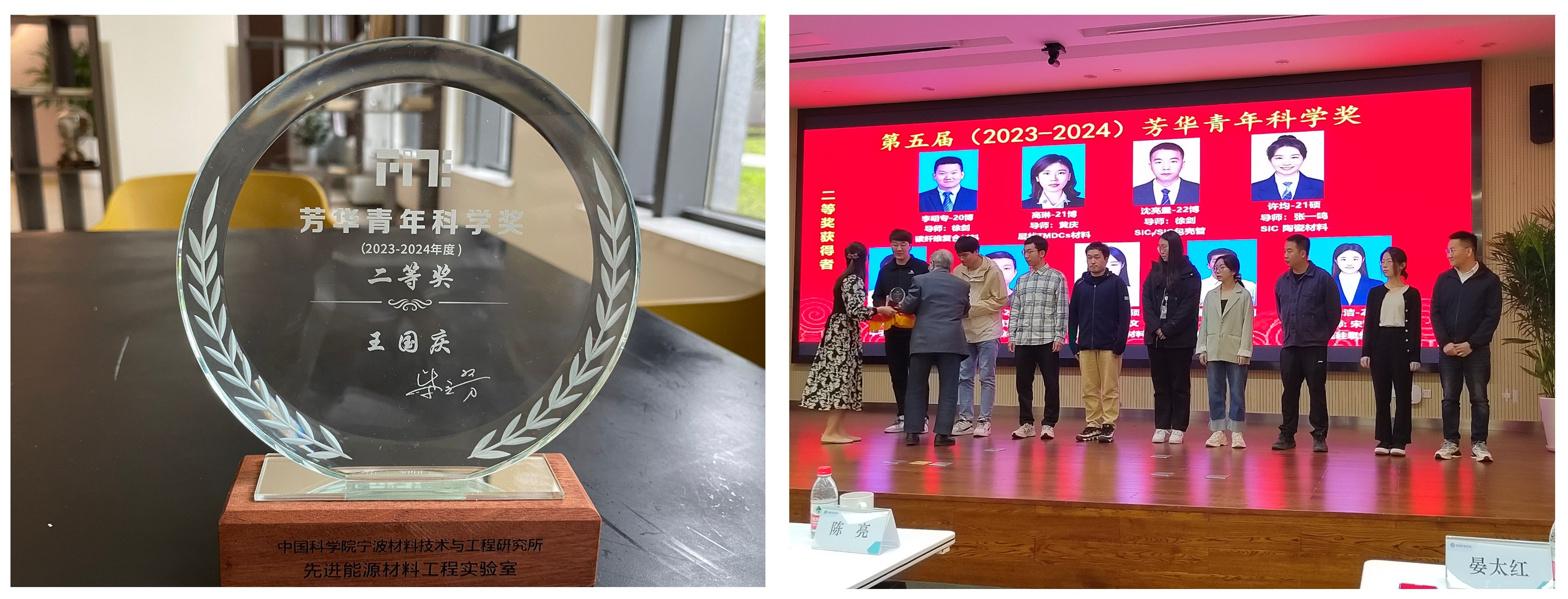 本网讯 近日,beat365官网材料与化学工程学院张峰君教授和中国科学院宁波材料技术与工程研究所周小兵研究员联合培养的2021级硕士研究生王国庆,在参加中科院宁波材料所先进核能材料实验室暨全省数据驱动高安全能源材料及应用重点实验室的揭牌仪式上获得了“芳华青年科学奖”二等奖(一等奖空缺)。