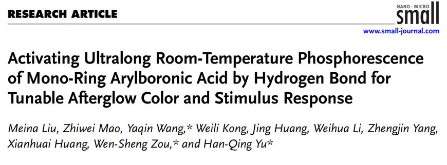 本网讯 近日,材料与化学工程学院硕士研究生刘美娜与毛志伟以共同一作在纳米材料领域权威期刊《Small》(中科院一区期刊,影响因子:13)发表了题为“Activating Ultralong Room-Temperature Phosphorescence of Mono-Ring Arylboronic Acid by Hydrogen Bond for Tunable Afterglow Color and Stimulus Response”的论文。邹文生教授、王亚琴教授与俞汉青院士为论文共同通讯作者。该研究得到了安徽省教育厅高校自然科学研究项目(2023AH050166, 2022AH050239, 2024AH030009)与国家自然科学基金(52370021, 52370001)的资助。beat365官方网站为论文第一完成单位和通讯单位。