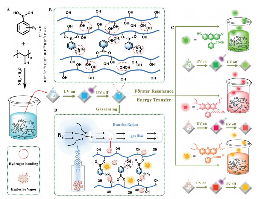 本研究通过点击化学将多种单环芳香烃硼酸(PBA)衍生物掺入聚乙烯醇(PVA)基质中,PBA 与 PVA 羟基之间的多个氢键以及聚合物基质产生的位阻,有效抑制了非辐射弛豫,触发了PBA的RTP。其中, 3-氨基苯基硼酸(3A-PBA)掺杂的PVA薄膜展示了最长的RTP寿命(2.24 s)和高量子产率(11.2%),以及快速灵敏的爆炸蒸汽探测能力;将荧光素(Flu)、罗丹明 6G (R6g)、罗丹明 B (Rb)这三种染料共掺杂到3A-PBA-PVA薄膜中,通过Förster共振能量转移方式观察到了T-S 或 T-S-S的长余辉发射,实现了能量受体的颜色调制和超长寿命。本工作预示着纯有机RTP材料发展的新时代,并为扩大其实际应用与增强性能提供了一个有前途的策略,特别是在环境监测和安全方面。