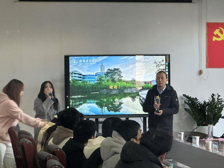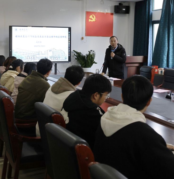 论坛启动仪式结束后,由材化学院赵东林教授担任论坛第一期主讲嘉宾,赵东林教授连续四年入选全球2%顶尖科学家,他以“碳纳米复合材料的制备及其在环境污染治理中的应用研究”为主题,围绕石墨烯功能化对水溶液里的重金属离子U(VI)、Cr(VI)以及有机物2,4-二氯苯酚的去除性能研究,探究了反应机理。结合实际应用,进行阐释说明,随后大家进行研讨交流。在同学们热烈的掌声中讲座告一段落,研究生代表向赵东林教授赠送了论坛纪念杯。第一期论坛的顺利举办,是一个良好开端,相信它也是后续论坛活动开展的基石。