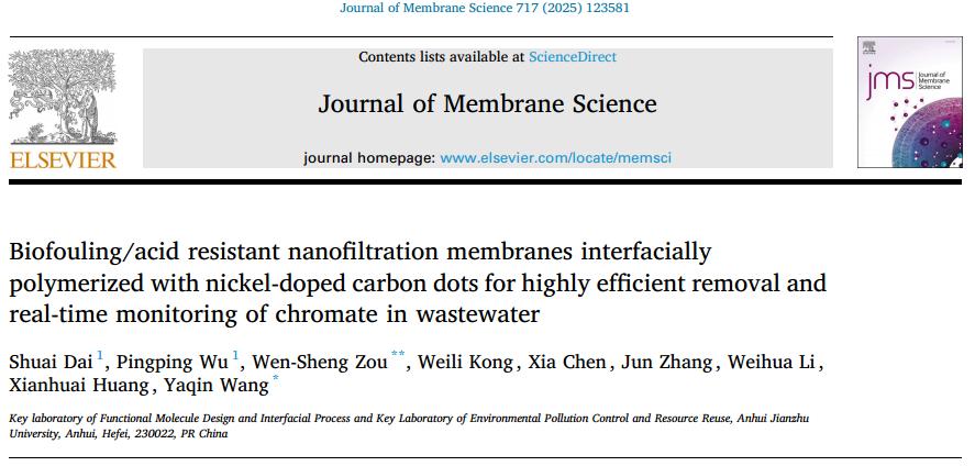 本网讯 近日,材化学院硕士研究生代帅与吴平平以共同一作在化学工程领域权威期刊《Journal of Membrane Science》(中科院一区TOP期刊,2024年影响因子:8.4)发表题为“Biofouling/acid resistant nanofiltration membranes interfacially polymerized with nickel-doped carbon dots for highly efficient removal and real-time monitoring of chromate in wastewater”的论文。邹文生教授、王亚琴教授为论文通讯作者。本工作得到安徽省自然科学研究项目和beat365官方网站博士创业基金以及国家自然科学基金项目(52370021和52370001)的资助。beat365官方网站为论文第一完成单位和通讯单位。