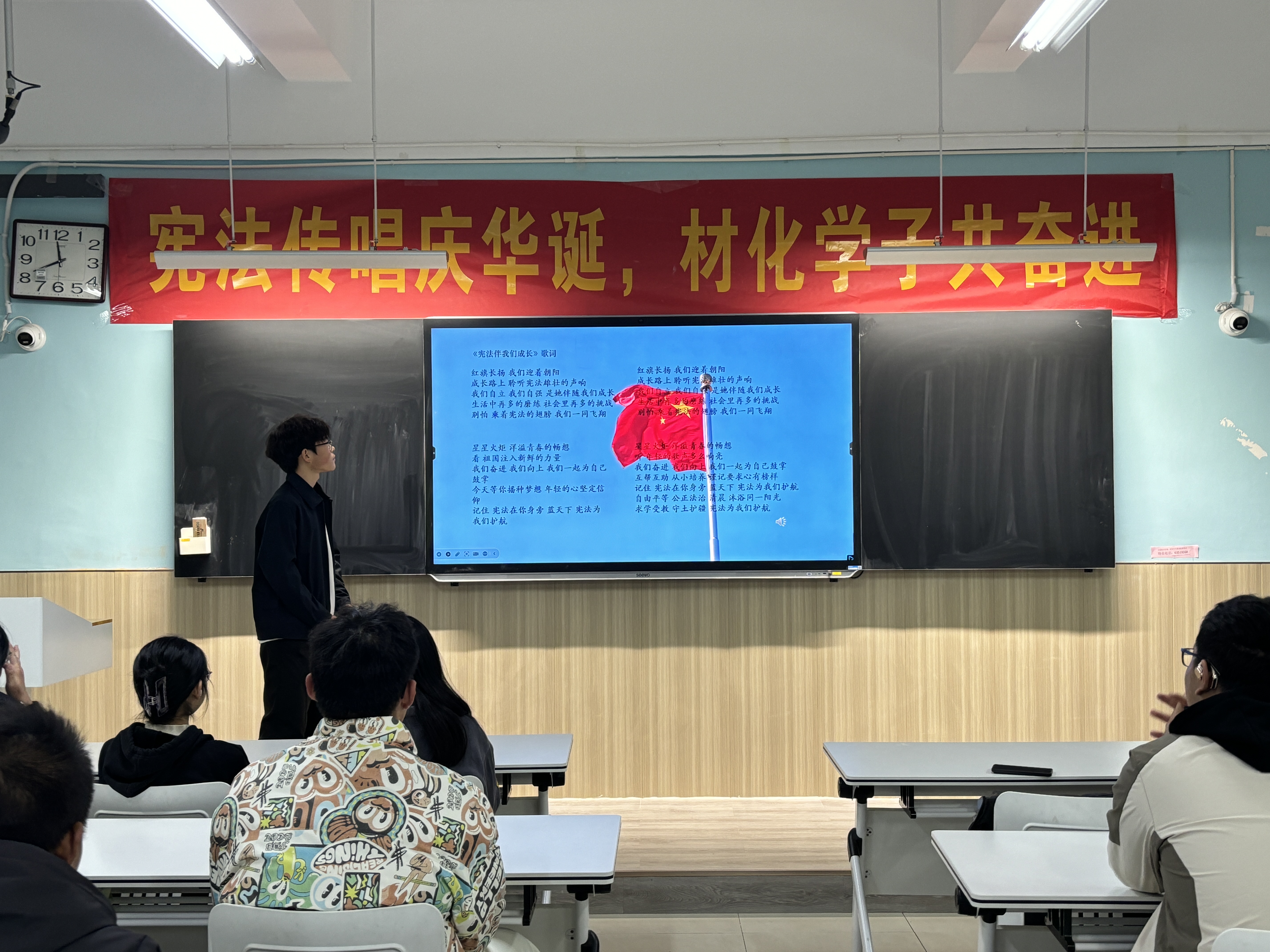 本网讯 在第十一个“国家宪法日”来临之际,为弘扬法治精神、践行宪法信仰,推进法治校园建设,材化学院于12月4日在主教楼1509 成功举办宪法传唱明信仰:材化学院共迎第十一个“国家宪法日”主题活动。学生以青春之声,奏响法治强音。