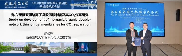 我院青年教师张劲辉全程参与了大会报告、分会场研讨等会议进程,并与参会专家学者就膜材料的结构调控、性能优化及工程化应用进行了深入交流。在“碳捕集与利用”分会场中,张劲辉作了题为“有机/无机双网络离子凝胶薄膜制备及其CO₂分离研究”的学术报告,系统介绍了其在离子凝胶薄膜设计与CO₂高效分离领域的研究进展。针对传统聚合物膜在高温高湿条件下稳定性差、分离效率低的问题,研究团队创新性地提出“有机/无机双网络协同增强”策略,通过构筑互穿网络结构,实现了离子凝胶薄膜机械强度与气体渗透选择性的同步提升。