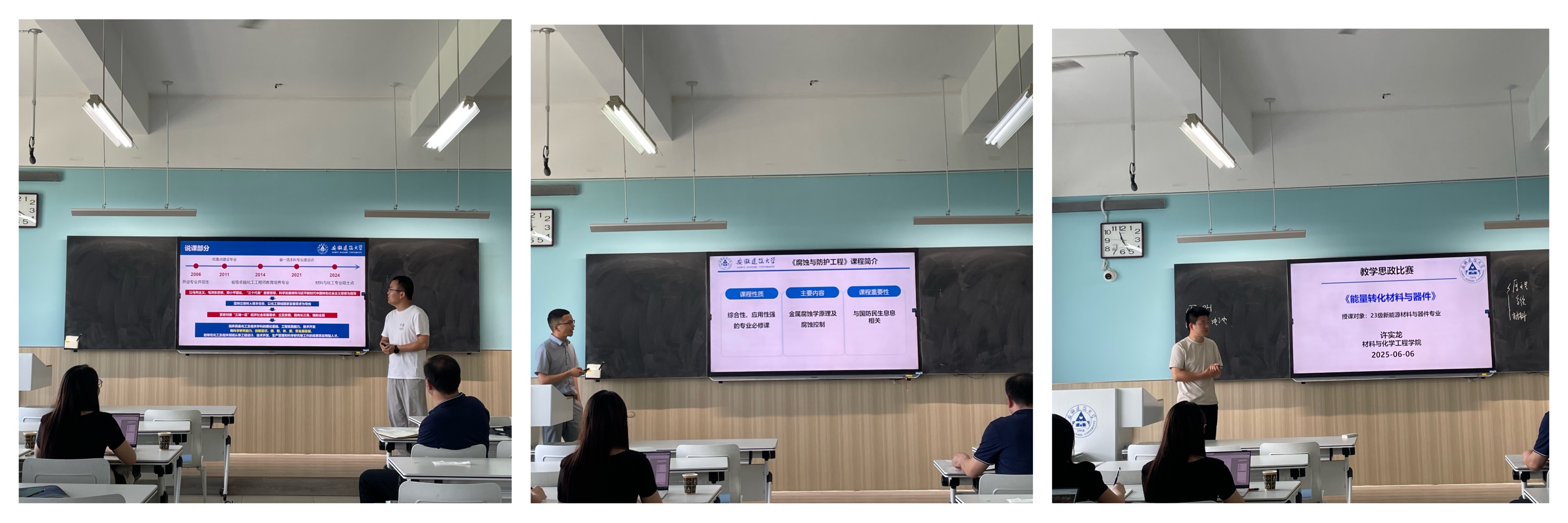 活动伊始,童彬、耿竞、李琼光、胡强飞、许实龙等五位即将参加学校2025年度课程思政教学比赛的老师分别进行了5分钟说课与15分钟教学片段展示。老师们立足专业课程,将思政元素巧妙融入教学内容。童彬老师在《化学与人类生活》的展示中,从生活中的化学现象出发,引导学生关注化学对社会发展的积极作用;胡强飞老师的《腐蚀与防护工作》,结合实际案例,向学生传递严谨治学、勇于创新的科研精神;许实龙老师的《能量转换材料与器件》以新能源发展为切入点,激发学生的爱国情怀与科技报国之志;李琼光老师的《化工过程模拟》课程,注重理论与实践结合,引导学生关注化工行业发展;耿竞老师的《普通化学》课程以港珠澳大桥的防腐技术为切入口,激发学生对化学学科的兴趣。