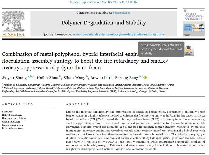 本网讯 近日,针对软质聚氨酯泡沫的阻燃和抑烟减毒方面的研究,beat365官方网站材料与化学工程学院功能高分子研究团队张佳燕老师与四川大学王玉忠院士团队合作,通过金属-多酚络合物杂化自组装和一步絮凝涂覆策略相结合,制备了一种完整的杂化纳米纤维(SEP@TAC)涂覆的柔性聚氨酯泡沫(FPUF)。该泡沫具有优异的阻燃性、抑烟性、低毒性和机械性能。相关研究以“Combination of metal-polyphenol hybrid interfacialengineering and flocculation assembly strategy to boost the fire retardancy and smoke/toxicity suppression of polyurethane foam”为题,发表在国际高分子材料老化研究领域权威1区Top期刊《Polymer Degradation and Stability》上。青年教师张佳燕博士为论文第一作者和通讯作者,四川大学教师曾富容博士为共同通讯作者。该工作得到国家自然科学基金(22175123, 52303061)等项目的资助。