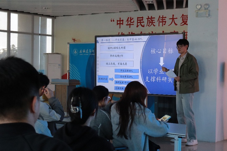 本网讯 为持续深化科研育人,赋能研究生科研创新能力高质量发展,我院学术活动“材睿论坛”系列讲座持续深入推进。2025年10月23日,第七期材睿论坛于逸夫楼三楼易班活动中心成功开讲,本期特邀研究生朱嘉豪担任主讲,围绕学业、科研与竞赛等热点问题为同学们带来了一场内容丰富的学术报告,现场学术氛围浓厚。