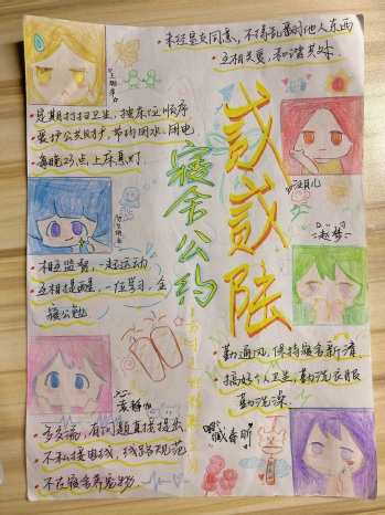 活动启动以来,同学们围绕作息规范、卫生维护、互助协作、文明交流等核心议题,结合寝室实际生活场景,设计出兼具实用性与趣味性的公约内容。有的寝室以“早睡早起不熬夜,课堂精神倍儿好”“垃圾日产不堆积,窗明几净心舒畅”等朗朗上口的短句凝聚共识;有的则加入“互助学习小组”“轮流值日责任制”等具体机制,让公约落地见效;部分寝室还融入环保理念与兴趣特色,将“节约水电随手关”“安静氛围共守护”等要求转化为生动的图文海报。