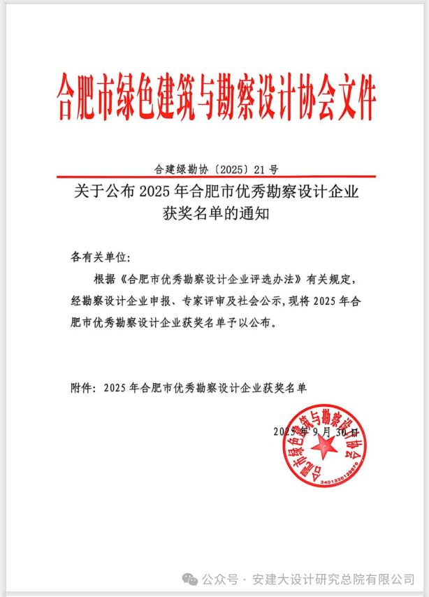 本网讯:近日,合肥市绿色建筑与勘察设计协会发布《关于公布2025年度合肥市优秀勘察设计企业名单的通知》(合建绿勘协〔2025〕21号),beat365官方网站设计研究总院有限公司被评为2025年度合肥市优秀勘察设计企业;员工樊攀荣获2025年合肥市绿色建筑与勘察设计先进个人。