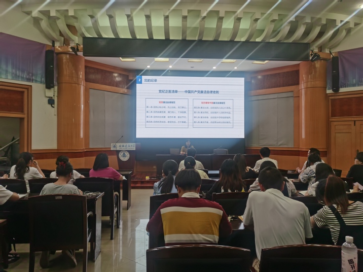 帅英以《学条例 守党纪 强党性》为题,从党的规矩是什么、党的纪律有哪些及准确把握《条例》的主要内容三个方面进行了阐述和讲解,通过结合典型的警示案例,深入浅出地阐释了《条例》所蕴含的核心要义、基本精神和丰富实践要求,为全体师生党员准确领会和贯彻落实《条例》提供了有益指导。
