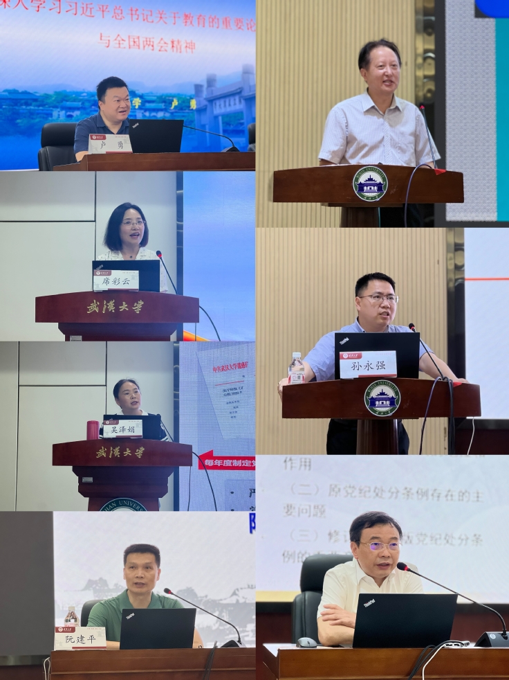 本次培训历时五天,武汉大学专家学者就深入学习习近平总书记关于教育的重要论述与全国两会精神,党建“双创”标杆学院、样板支部经验分享,最新国际局势与国家安全热点问题分析,新质生产视域下习近平总书记关于现代大学高质量发展理念的论述,科研能力提升与科研团队建设,深入学习《中国共产党纪律处分条例》进行了专题讲座,内容涉及党的建设、党建“双创”、国家安全、办学治校、科技创新、党纪学习教育等。7月18日,学校党委理论学习中心组在武汉大学当代楼一楼报告厅召开2024年度校党委理论学习中心组第九次学习会,第一时间传达学习中国共产党第二十届中央委员会第三次全体会议公报,学习习近平总书记近期关于党纪学习教育的重要论述和传达中央党的建设工作领导小组有关工作通知等。