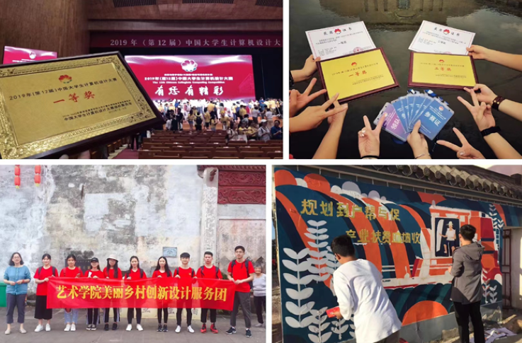 党支部也积极探索地方工科院校思政教育与美育教学融合的新路径。充分发挥艺术学院课程、课堂、文化、环境、人员等方面的艺术专业育人能力,结合马克思主义学院思政课程的教学成果,将美育教育作为学校特色育人体系重要的单元;通过发掘整理优秀艺术素材,作为课堂教学内容、艺术创作选题和课外实践活动的主题或素材,与课程思政相融相促;将艺术创作和教科研成果转化为教学实践,实现资源挖掘与资源再生有机结合,取得一系列丰硕成果;党员教师指导的学生创作的《绘字社会主义核心价值观》《一个城市70年的故事--合肥》《红色金寨》《百年辉煌·荣耀中国》等多部反映历史文化、思政教育成果的数字艺术作品,并在全国各类专业赛事中多次获得重大奖项,在全国艺术教育教学专业圈内受到广泛关注。