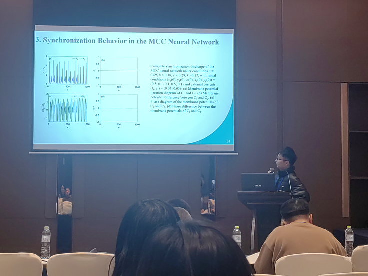 本次会议分为8个大会主旨报告和10个分会场报告两部分。分别进行了混沌系统设计与分析,忆阻神经元、神经网络及应用等方面的分享与交流。由李春彪和汪莉丽联合指导的23级新一代电子信息技术(含量子技术等)专业硕士高浩作了《Analysis of Complex Synchronization Behavior in Memristor-Coupled Chialvo Neurons model》的交流报告。汇报了基于忆阻耦合神经元构成的系统在外部激励电流变化条件下的同步行为及其分析,并展示了通过国产单片机CH32V307进行电路实验的结果。报告得到了相关领域专家们的高度认可,之后开展了交流和研讨。