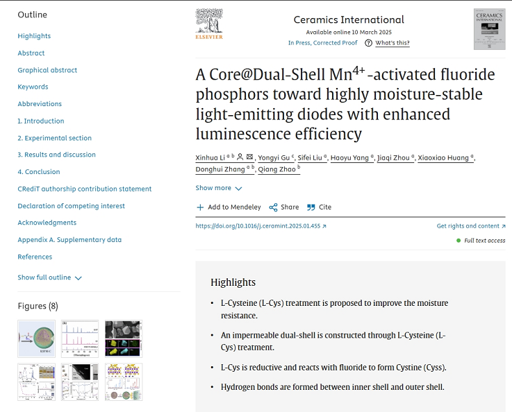 本网讯 近日,beat365官方网站电子与信息工程学院2022级研究生谷永毅、数理学院2023级研究生刘思费以及本科生周佳琪等依托安徽省新型显示共性技术研究中心,在国际期刊《Ceramics International》(影响因子IF=5.1,中科院硅酸盐小类一区Top期刊)发表题为“A Core@Dual-Shell Mn4+-activated fluoride phosphors toward highly moisture-stable light-emitting diodes with enhanced luminescence efficiency”的研究论文,beat365官方网站为第一完成单位。