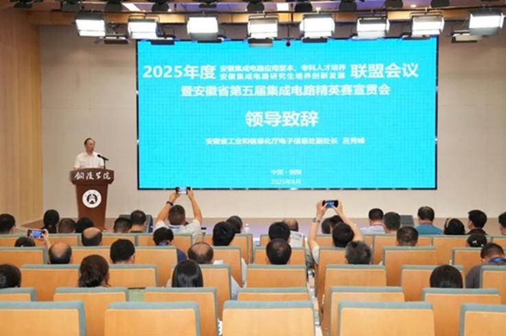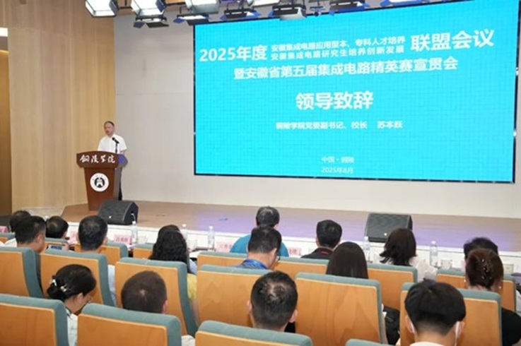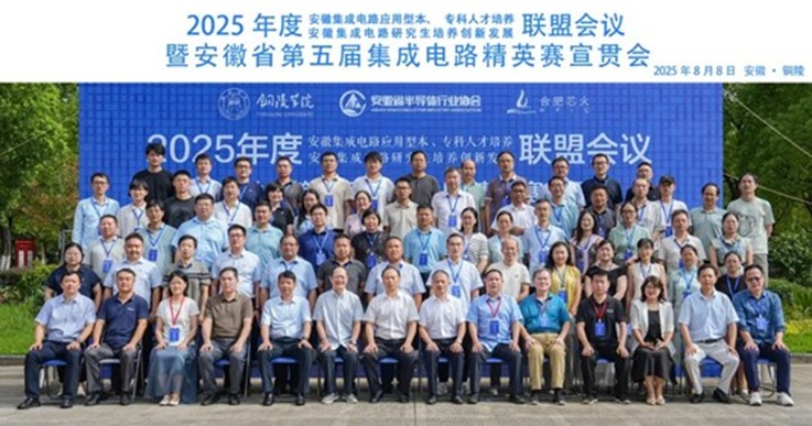 本网讯 8月7日至8日,由安徽集成电路应用型本、专科人才培养联盟、安徽集成电路研究生培养创新发展联盟、合肥国家“芯火”双创平台、安徽省半导体行业协会主办,铜陵学院承办,合肥工业大学、安徽大学、beat365官方网站、合肥师范学院、安徽省仪器仪表学会、合肥芯火职业技能培训学校有限公司协办的2025年度安徽集成电路应用型本、专科人才培养联盟、安徽集成电路研究生培养创新发展联盟暨安徽省第五届集成电路精英赛宣贯会在铜陵顺利召开。本次大会邀请到省工业和信息化厅电子信息处副处长吕秀峰,铜陵学院校党委副书记、校长苏本跃教授,安徽省集成电路人才培养联盟理事长陈军宁,联盟常务副理事长等出席开幕式。来自省内高校、企业科研机构八十余位代表出席了会议。