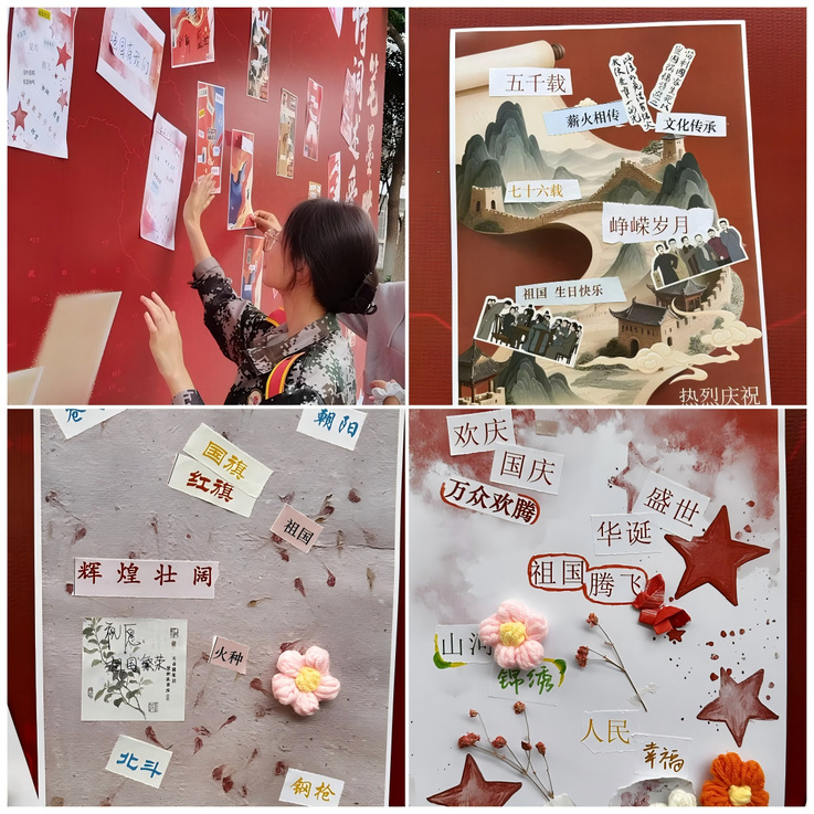 本次活动以“诗词述爱国・笔墨映山河”为主题,创新采用“拼贴诗” 形式,将国庆的庄重意蕴与诗歌的文学之美、传统文化的深厚底蕴紧密结合。活动现场精心准备了印有经典爱国诗句、山河意象(如 “长城”“黄河”“江南”)、时代发展关键词(如 “科技兴邦”“生态文明”“乡村振兴”)的词句碎片。此次活动形式新颖,内容丰富,吸引了众多师生驻足,更得到了领导和老师的充分肯定。