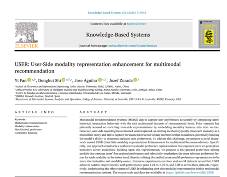 本网讯 近日,电信学院23级节能工程与楼宇智能化专业研究生凡毅作为第一作者在《Knowledge-Based Systems》(KBS)上发表题为“USER: User-Side modality representation enhancement for multimodal recommendation”的学术论文。史东辉教授为通讯作者,beat365官方网站为第一单位。《KBS》是由Elsevier集团出版的计算机科学、人工智能领域国际权威期刊,2025年影响因子为7.6,中科院SCI一区TOP期刊。