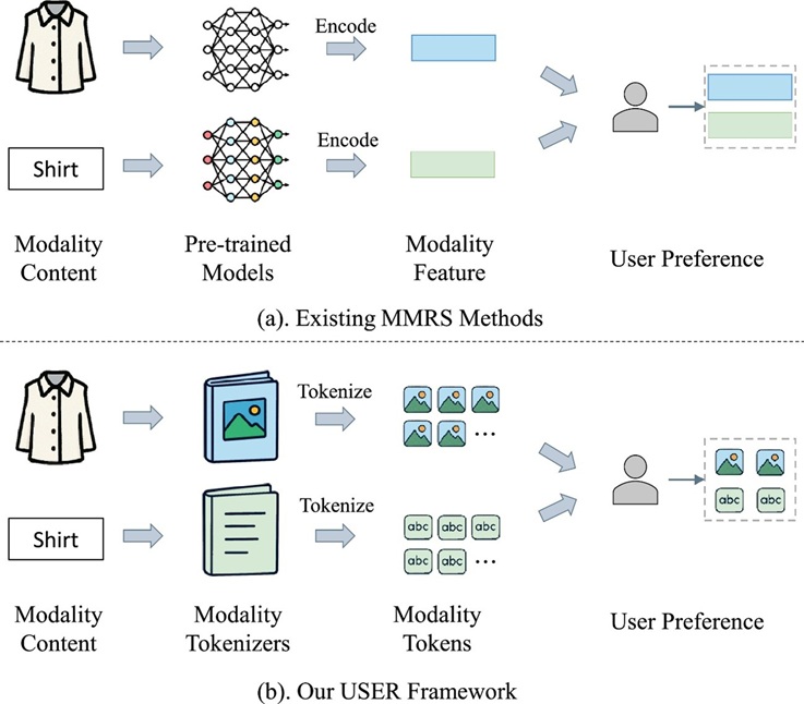 为了解决这一难题,该文提出了一种名为USER(User-Side modality representation Enhancement for multimodal Recommendation,即用于多模态推荐的用户侧模态表示增强)的新颖框架。具体而言,该方法构建了一个统一的跨模态偏好表示,以捕捉用户在跨模态间的共同感知行为。在此基础上,提出了一个细粒度偏好挖掘模块,该模块能够提取用户的细粒度偏好,并在词元(Token)级别上为每个模态选择性地强调最相关的偏好因子,从而将统一的跨模态偏好表示精炼得更具区分性和模态感知能力。