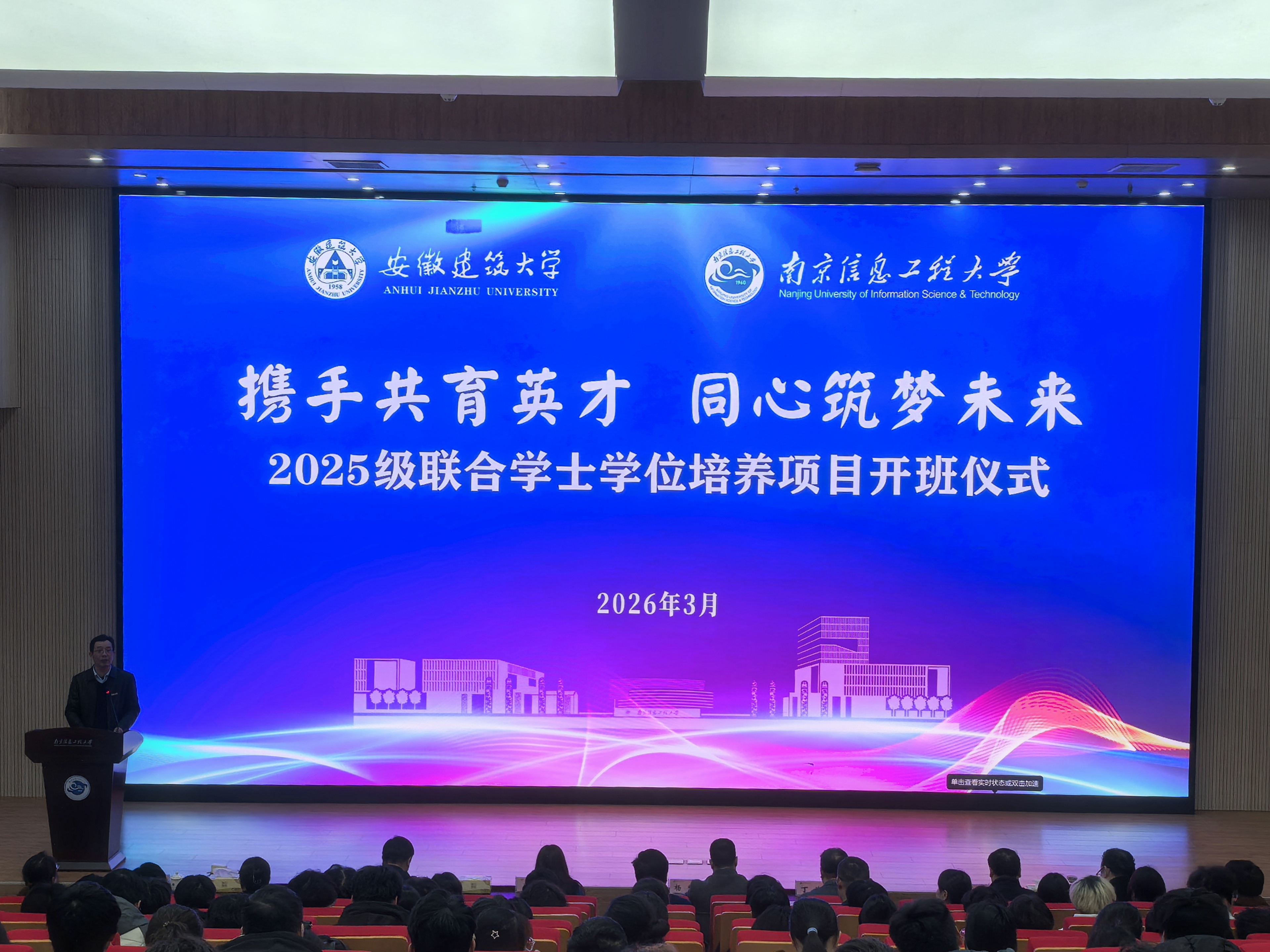 本网讯 3月18日,beat365官方网站-南京信息工程大学2025级本科生联培班开班仪式在滁州天长金牛湖产教融合园区千秋会堂举行。校党委常委、副校长杨科,南京信息工程大学党委常委、副校长马嫣出席仪式。学校长三角区域高等教育一体化示范区共建办公室、学生工作部、本科生院、研究生院、电子与信息工程学院负责人及工作人员,南京信息工程大学相关职能部门负责人、金牛湖园区管委会有关负责人、教师代表,以及2025级联培班学生参加开班仪式。