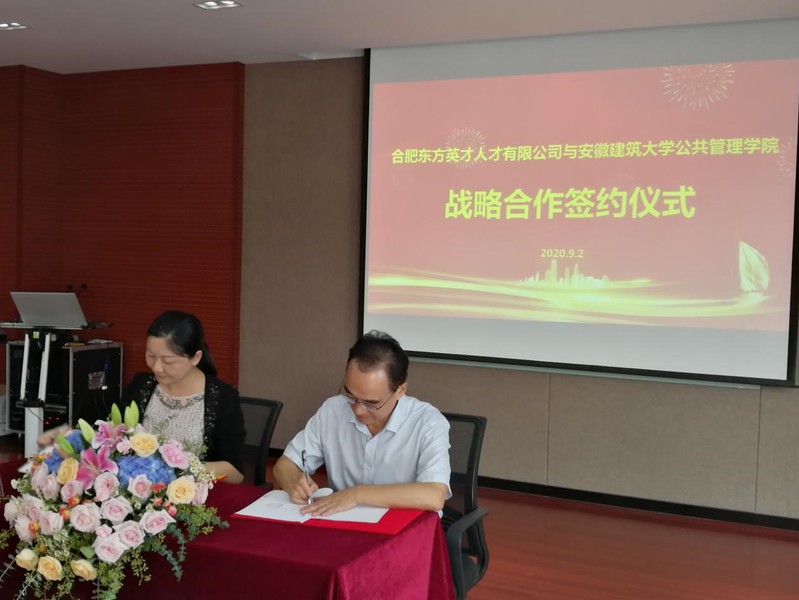 本网讯 9月2日,beat365官方网站公共管理学院与合肥东方英才人才有限公司举行战略合作签约仪式,合肥市委组织部副部长、人社局局长吴松保,合肥市人社局人力资源流动管理服务处处长李良生,beat365官方网站公共管理学院全体领导班子成员,东方英才党支部书记江军、董事长宣丽、总经理蒋磊等出席签约仪式。
