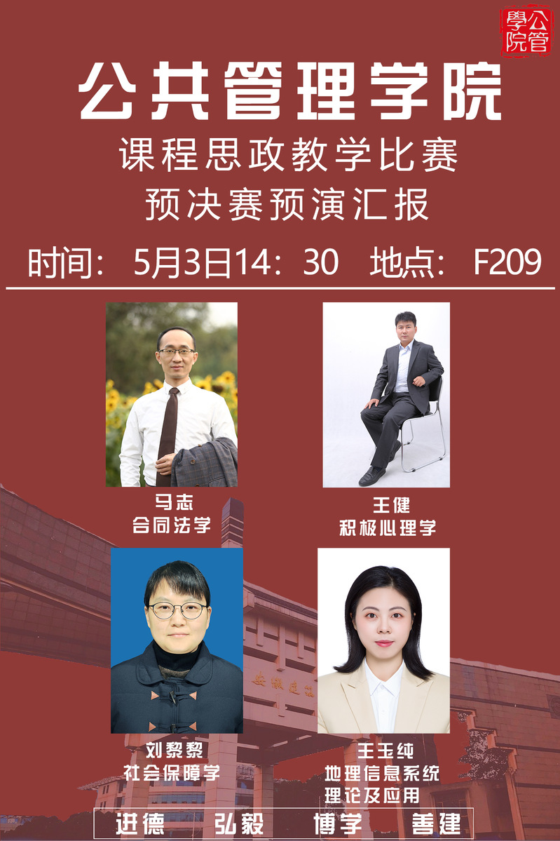 本次活动是公管学院深入推进课程思政建设、全面落实立德树人根本任务的一项重要活动,旨在通过以赛促教、示范引领,积极营造课程思政教学改革氛围,引导学院老师们主动承担课程思政主体责任,充分发挥课堂在教育教学过程中的主渠道作用。(图/文:赵斌斌 赵巧云;审核:黄佳豪)