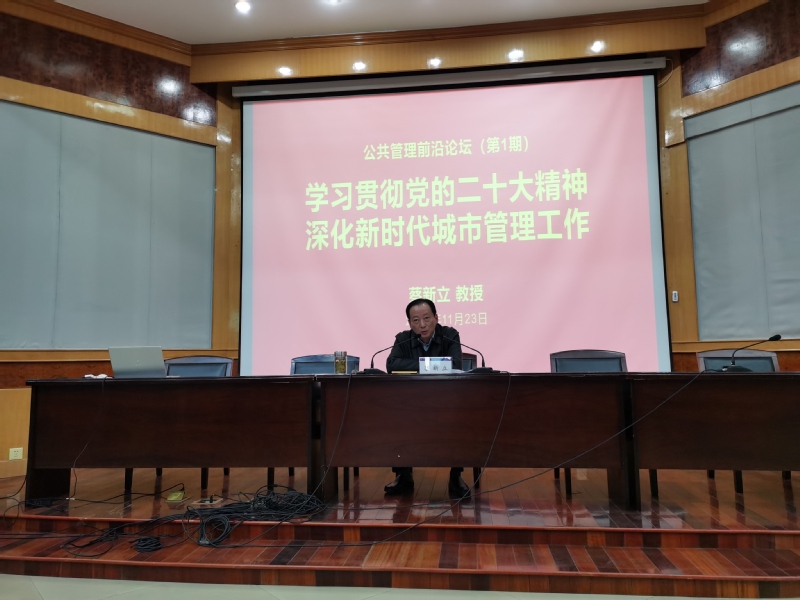 本网讯  为庆祝党的二十大胜利召开,引导广大青年学生深入学习贯彻党的二十大精神,鼓励广大师生在新时代城市管理工作中建功立业,11月23日,公管学院在北校区F楼3楼报告厅举办公共管理前沿论坛第1期暨二十大精神解读报告会,邀请校党委常委、副校长蔡新立教授主讲“学习贯彻党的二十大精神,深化新时代城市管理工作”的学术报告。公管学院院长黄佳豪主持,学院党政领导班子、相关专业系教师及城市管理等专业同学共160余人参加活动。