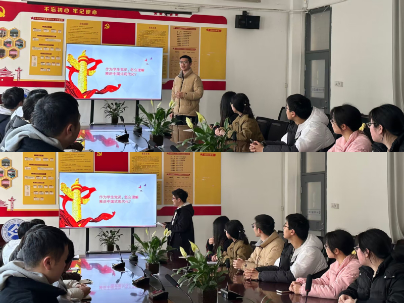 会上,党支部书记带领同学们观看了习近平总书记在学习贯彻党的二十大精神研讨班开班式上发表的重要讲话,并就讲话内容组织学生党员积极开展研讨。