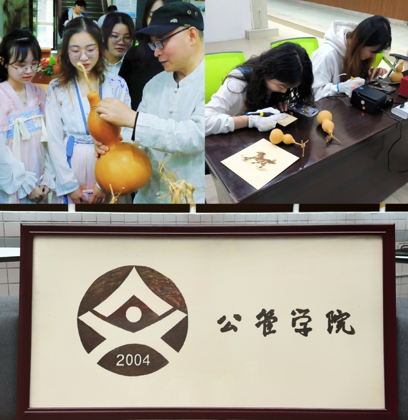 劳育+美育。以美育劳、以美促劳、美劳共生,注重在劳动中发现美、培育美、创造美,提高学生审美能力,培养劳动精神。公管学院邀请非遗葫芦烙画传承人郑小良解说安徽“火笔画”的发展历史、展示葫芦烙画的创作过程。郑小良邀请同学们体验葫芦烙画的创作过程,现场制作以公管学院为主题的火笔画作品赠予学院作为纪念,让学生在非遗葫芦烙画传统工艺制作中欣赏美、寻找美、创造美、鉴赏美。