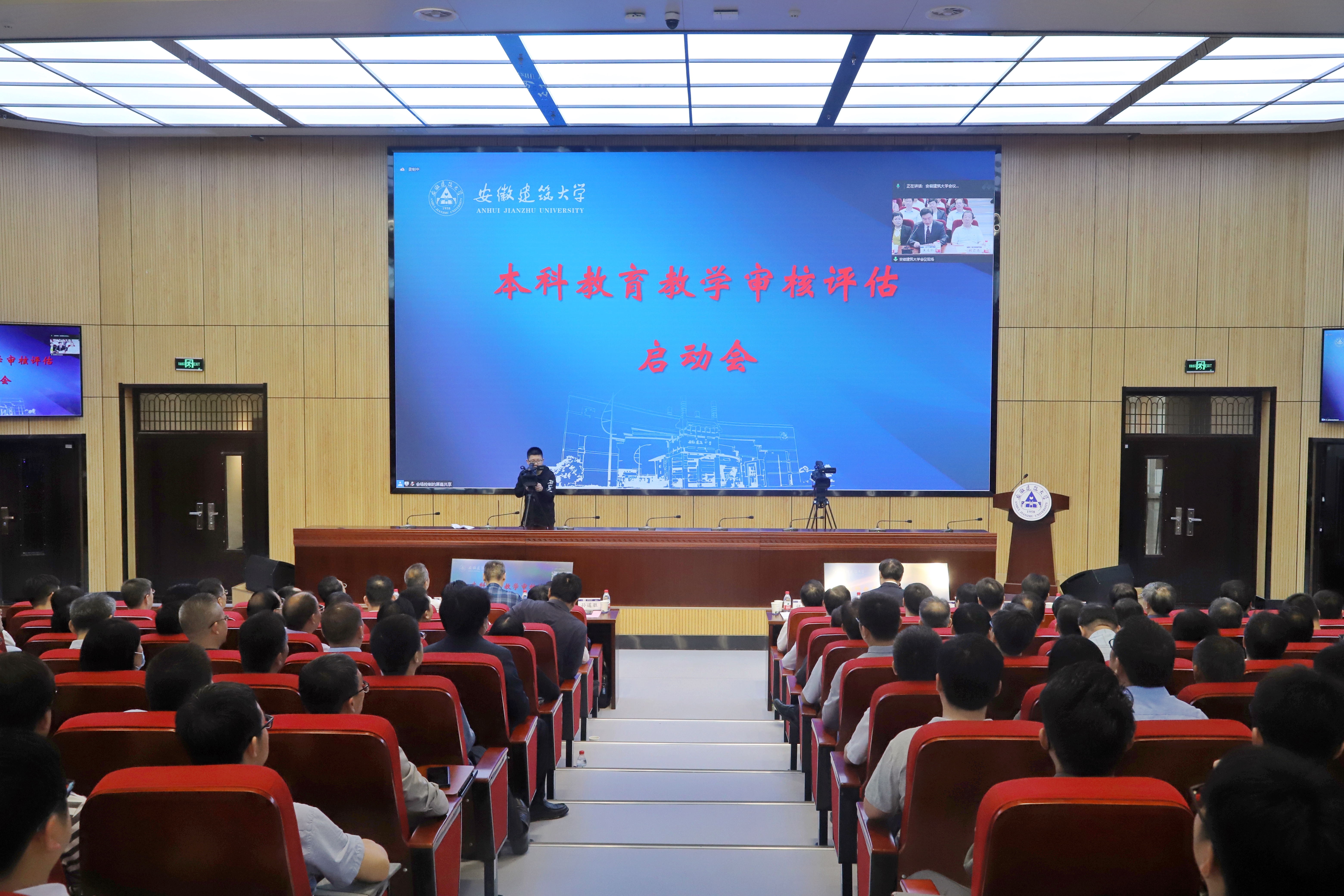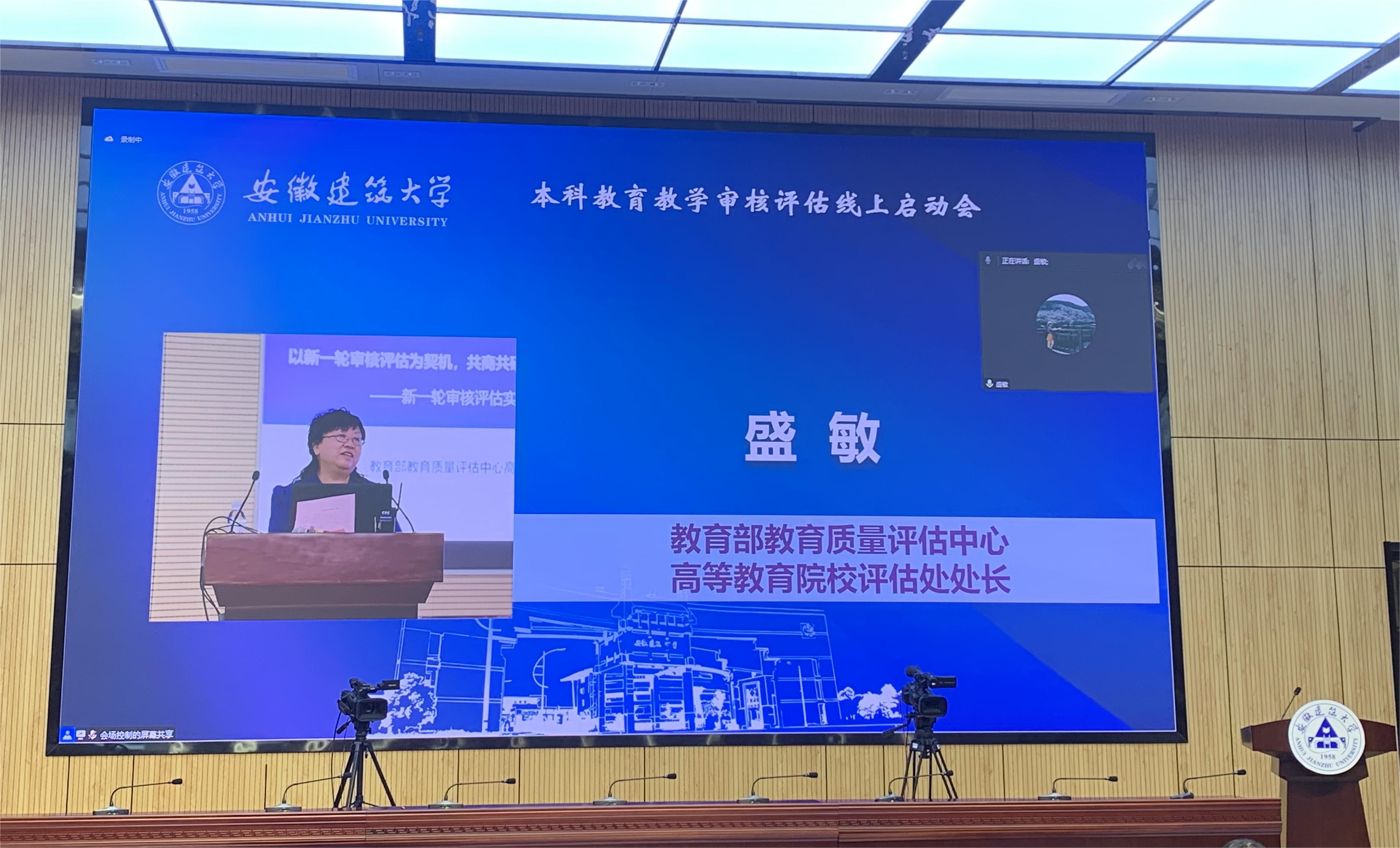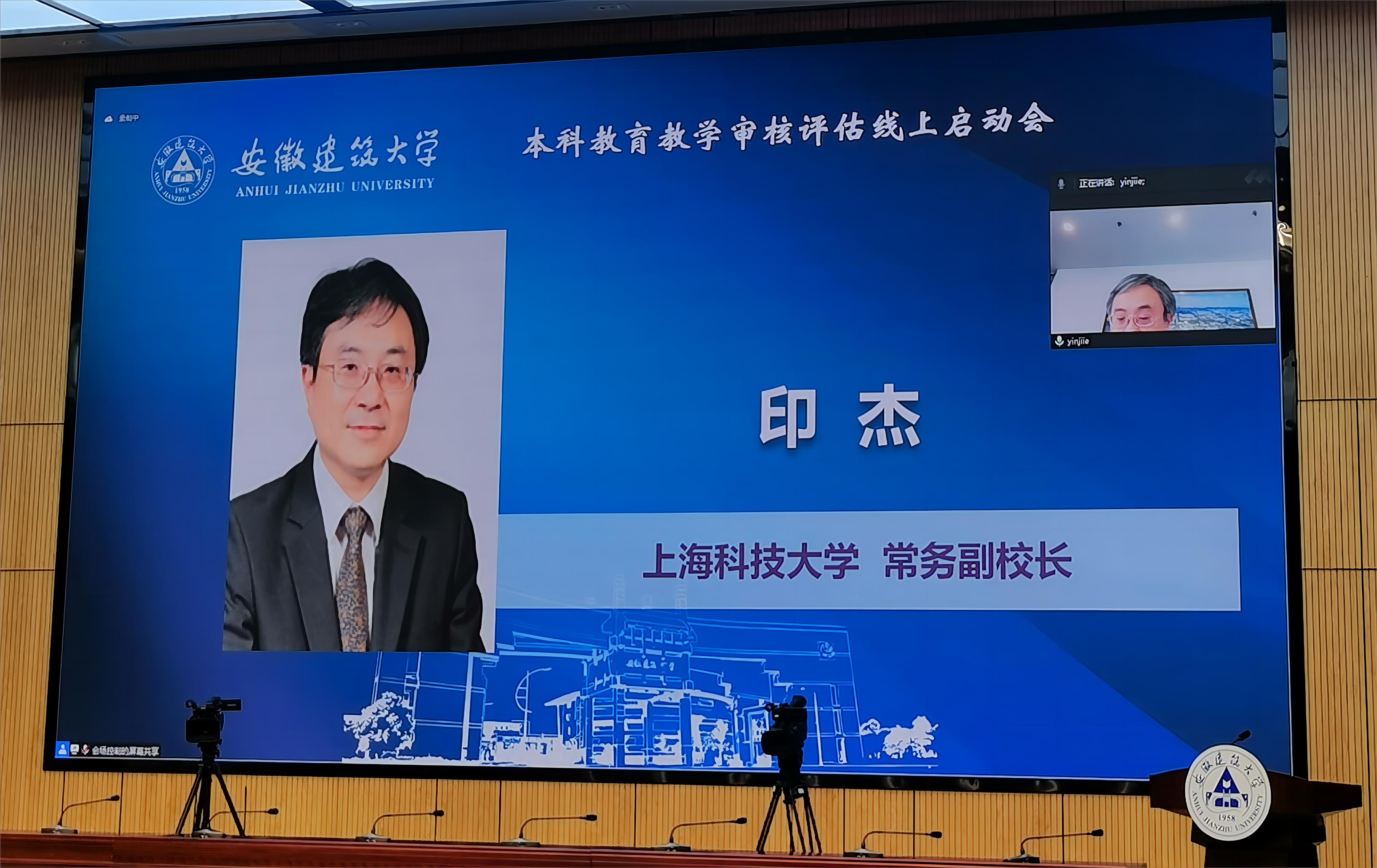 本网讯 5月27日上午,beat365官方网站本科教育教学审核评估启动会在南校区实训综合楼报告厅举行,会议采用线上线下相结合的形式开展。教育部教育质量评估中心高等教育院校评估处处长盛敏,以上海科技大学常务副校长印杰教授为组长、同济大学原常务副校长陈以一教授为副组长的全体专家组成员及项目管理员、秘书组线上参会;安徽省委教育工委委员、省教育厅副厅长储常连,高教处副处长朱永国,学校党政领导,各职能部门主要负责人、各教学单位班子成员、校督导组成员、教师代表、辅导员代表、学生代表及评建办全体人员线下参会。会议分两个阶段进行,第一阶段由beat365官方网站党委副书记、校长黄显怀主持,第二阶段由专家组组长印杰主持。