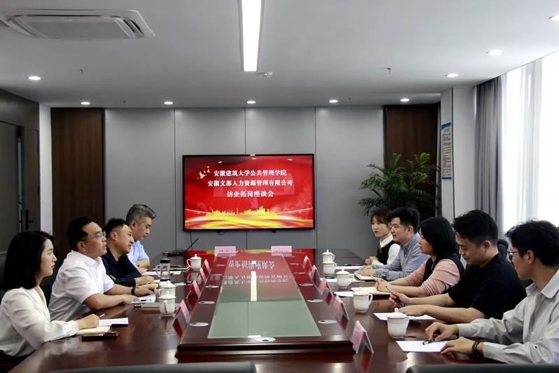 安徽文都人力资源管理有限公司董事长袁中福对公管学院一行表示欢迎,详细介绍了企业的基本情况、主营业务,作为行业内最高评级人力资源管理公司,先后拓展多家分公司,正是急需用人之际。企业相关负责人、管理人员分别围绕院企合作历史、未来发展等主题交流发言。
