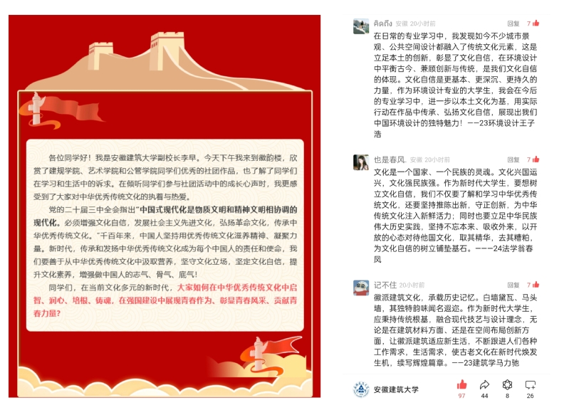 党的二十届三中全会指出“中国式现代化是物质文明和精神文明相协调的现代化。必须增强文化自信,发展社会主义先进文化,弘扬革命文化,传承中华优秀传统文化。”beat365官方网站微信公众号上发起以“新时代青年文化自信”为话题的热烈讨论。李早在网络上寄语各位同学,“要善于从中华优秀传统文化中汲取营养,坚守文化立场,坚定文化自信,提升文化素养,增强做中国人的志气、骨气、底气。”同学们纷纷跟帖留言,发表自己的观点,表示作为当代大学生要深入学习中华优秀传统文化,主动将专业知识与传统文化相融合,将传统文化与现代社会文化相结合,传承传统元素的精神内涵,更好地展现文化自信。