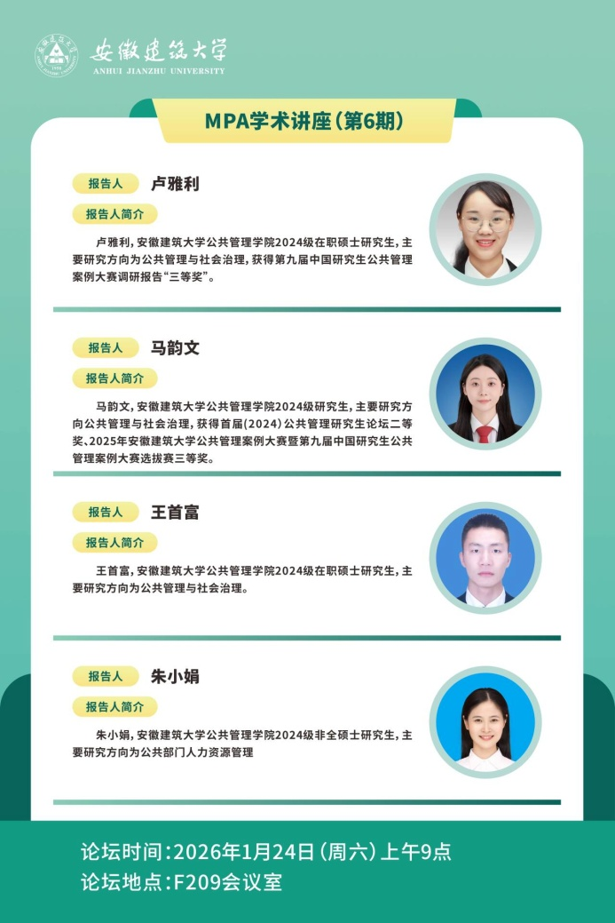 本网讯  为进一步拓宽学生学术视野,激发学术创新思维。124日上午9点,公管学院在F209会议室举办了MPA学术讲座(第6期)。本次讲座以公共管理领域热点议题为核心展开交流,邀请了卢雅利、马韵文、王首富、朱小娟等四位2024MPA研究生进行学术分享,吸引了众多学生参与,现场氛围热烈,学术气息浓厚。