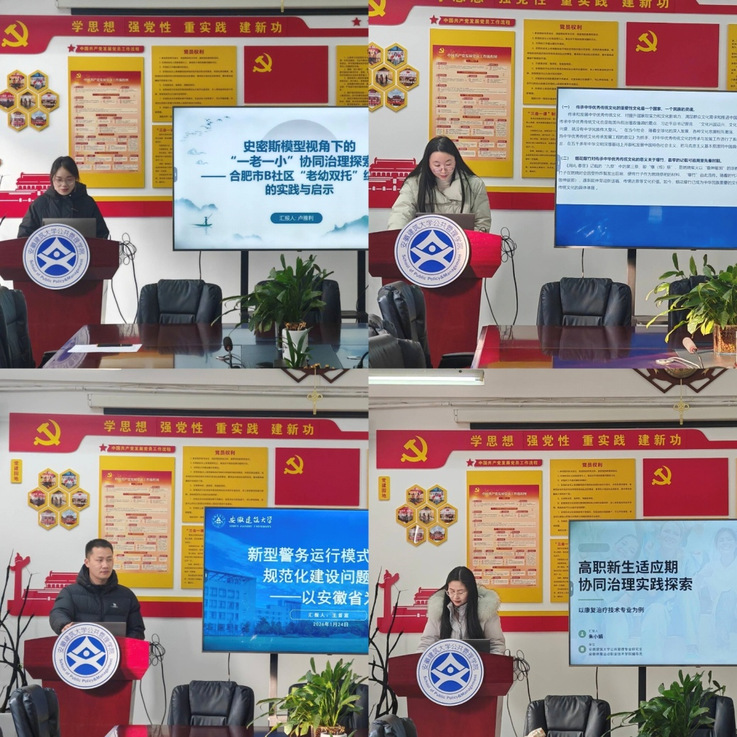 在汇报分享环节,卢雅利以《史密斯模型视角下的“一老一小”协同治理探索——合肥市B社区“老幼双托”综合体的实践与启示》为题,深入剖析了在老龄化与少子化叠加背景下,“老幼共托”模式所面临的现实挑战以及相应的解决对策,以破解“一老一小”照护难题,推动协同治理优化。马韵文以《新质生产力赋能烟花爆竹传承发展路径探究》为题,围绕烟花爆竹这一中华优秀传统文化载体,结合新质生产力理念展开深入探究,强调需通过综合性传承、融合新质生产力创新,以及政府政策扶持与社会广泛参与,推动烟花爆竹产业升级与文化永续传承。王首富以《新型警务运行模式下执法规范化建设问题研究——以安徽省为例》为题,结合公安机关执法实践经验,从执法程序、证据规则、民警裁量权、法律伦理四大维度分析了警务现代化进程中面临的规范衔接困境,提出了制度、机制、技术、人员四位一体的系统性解决对策。朱小娟以《高职新生适应期协同治理实践探索——以康复治疗技术专业为例》为题,针对高职新生在学业、生活、心理等方面的适应难题,构建了“校—班—家”三位一体协同治理模式,并通过实证数据验证了该模式可以有效解决新生适应问题。
