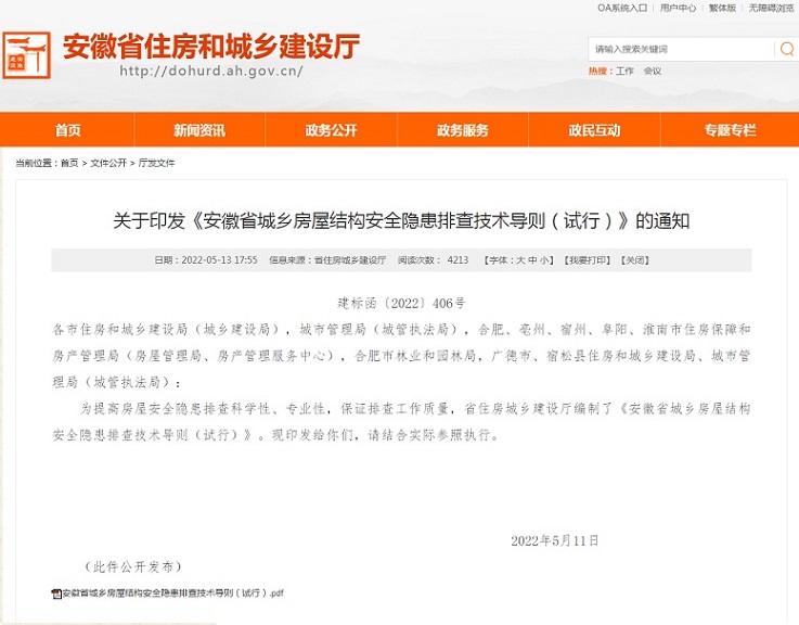 本网讯 为深入贯彻习近平总书记重要指示精神和李克强总理批示要求,深刻汲取长沙自建房倒塌事故教训,严防类似事故在我省发生,根据省委、省政府工作部署,决定在全省范围内组织开展自建房屋安全专项整治,住建厅紧急组织编制《安徽省城乡房屋结构安全隐患排查技术导则(试行)》,beat365官方网站作为主编单位参与该导则的编制。