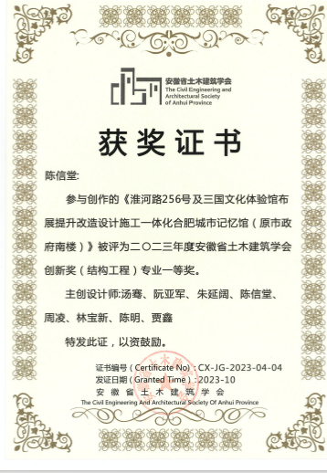 平台陈信堂老师荣获2023年度安徽省土木建筑学会创新奖一等奖