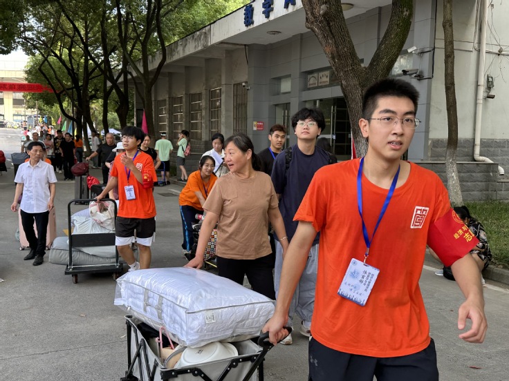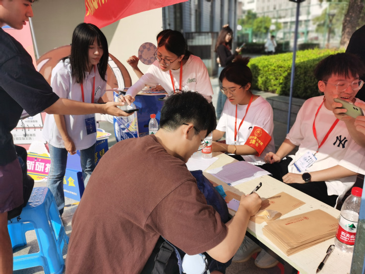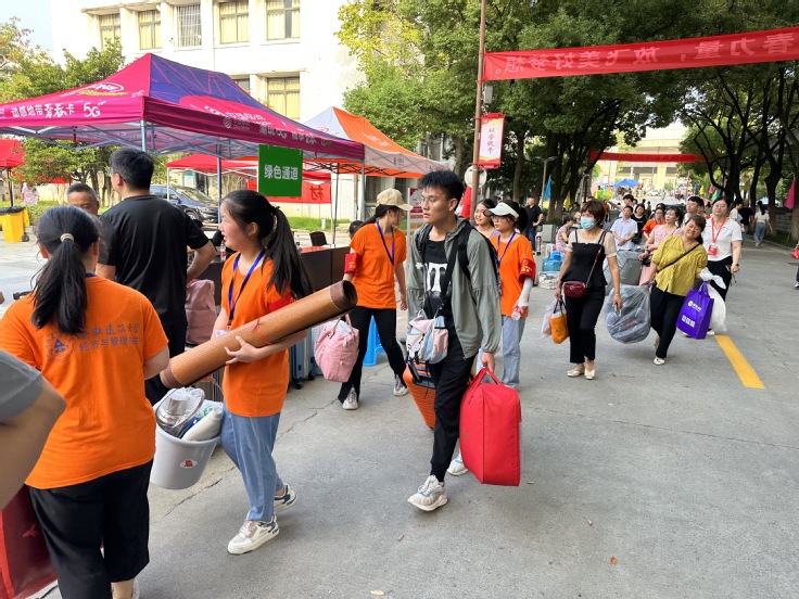 清晨时分,学生志愿者早已到达迎新地点进行布置,志愿者们各司其职,有条不紊,以优质的服务迎接新生,耐心地与家长沟通,协助23级新生报名登记、领取住宿卡、搬运行李、办理宿舍入住等。各项入学办理工作秩序井然、严谨高效。