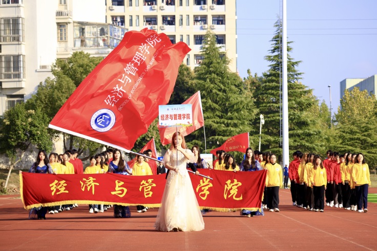 方阵展示环节,各学院方阵伴着激昂的音乐依次入场。在全场的注视下,经管学子昂首阔步,“经管精英,驰骋赛场,奋力拼搏,逐梦远航!”的口号响彻田径场,每一次踏步都充满力量,每一声呼喊都充满热情,经管学子团结向上的精神风貌感染着在场的每一个人。